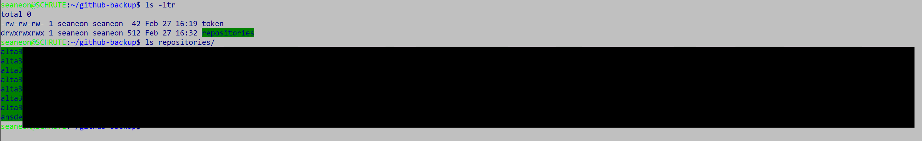 We were able to create an access token that we can use for a variety of needs. In our case, this gives us the ability to access our GitHub organization remotely from a machine of our choosing. This means if you have access to that token, you have access to your team’s GitHub repositories. YAY! The second item we accomplished was actually backing up our GitHub organization as a whole. The reason this is important to me is two-fold. First, I am not confident that GitHub will always be there in times of need. The second reason is it’s good to have a backup that you can fully recover from in the absence of a service like GitHub.